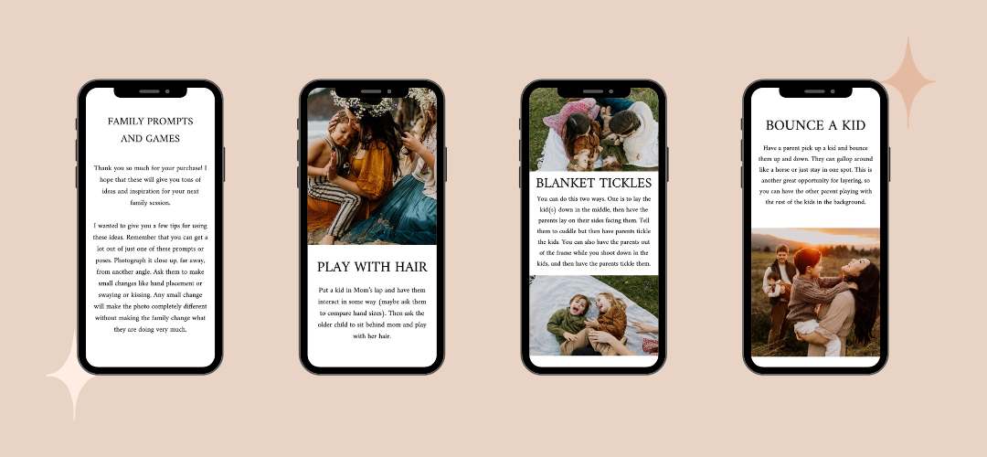 This includes 50 prompts and poses to help you bring out connection with your clients during your next family session. I will show you photo examples along with the prompt or pose instructions. I even give you tips to really make it your own. These cards are delivered in digital form (as a pdf and as individual images) and are meant to be kept on your phone for easy viewing before or during your session.
